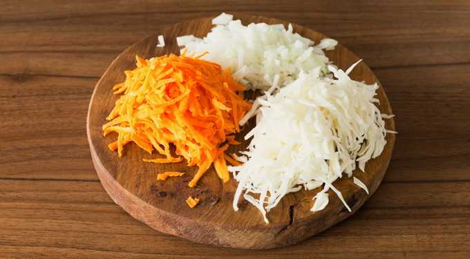 Maal witte kool en uien. Wrijf de wortelen op een grove rasp.