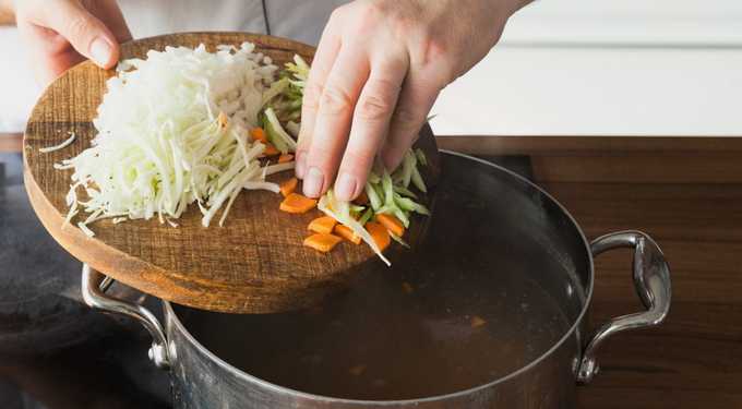- Kook kippenbouillon. Voeg eerst aardappelen toe, dan kool, wortelen, uien en tomaten. Kook tot alle ingrediënten gaar zijn.