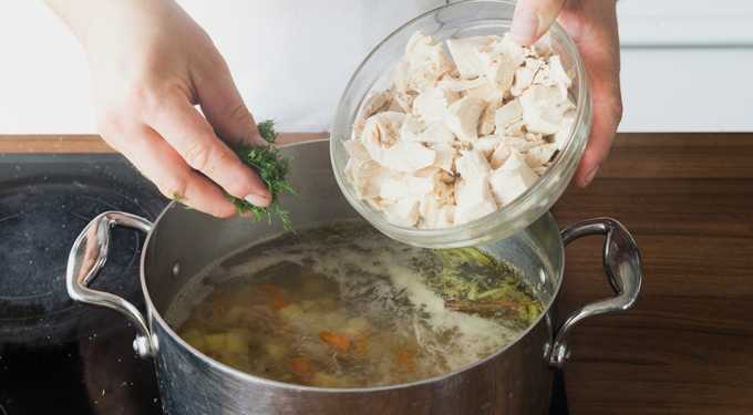 Nadat de aardappelen zacht zijn, snijdt u het kippenvlees en stuurt u het naar de pan. We voegen ook gehakte dille toe. Kook gedurende 3 minuten en haal van het fornuis.