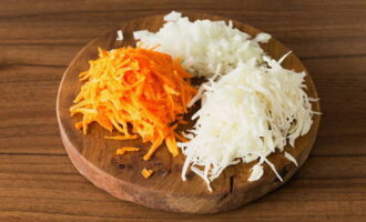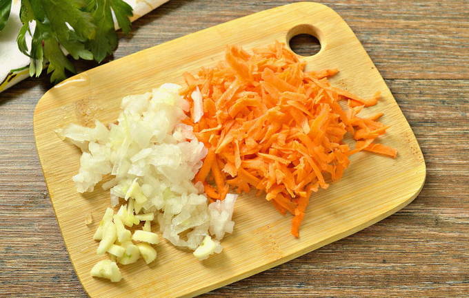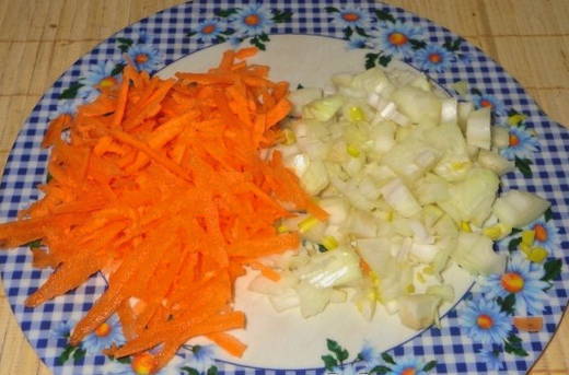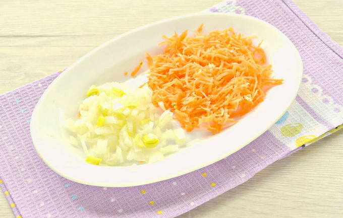 - Laten we beginnen met het verwerken van uien en wortelen. Wij reinigen beide producten en spoelen. Snijd de ui in kleine stukjes. En voor het hakken van wortels gebruiken we een rasp.