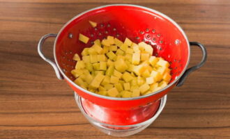 Aardappels schillen, afspoelen, in blokjes snijden. We doen de aardappelen in een vergiet en spoelen om overtollig zetmeel weg te spoelen.