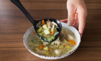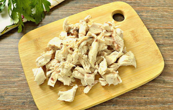 - We nemen kippenvlees en spoelen het onder stromend water. We zetten het in een pan met water en koken tot het gaar is. Zout de bouillon. We halen de kip uit de pan. Laat afkoelen en snij dan in middelgrote stukken. Later sturen we het vlees terug naar de bouillon.