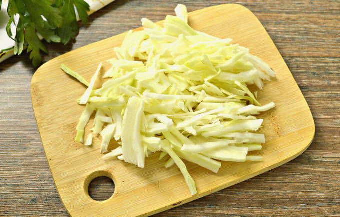 - Spoel de kipfilet goed af onder stromend water. We leggen een papieren handdoek neer en leggen de kip erop, vegen hem af. Leg de filet in een pan met koud water en kook gaar. Haal de afgewerkte kip uit de pan. Zout de bouillon. Giet de voorgesneden kool in een pan.