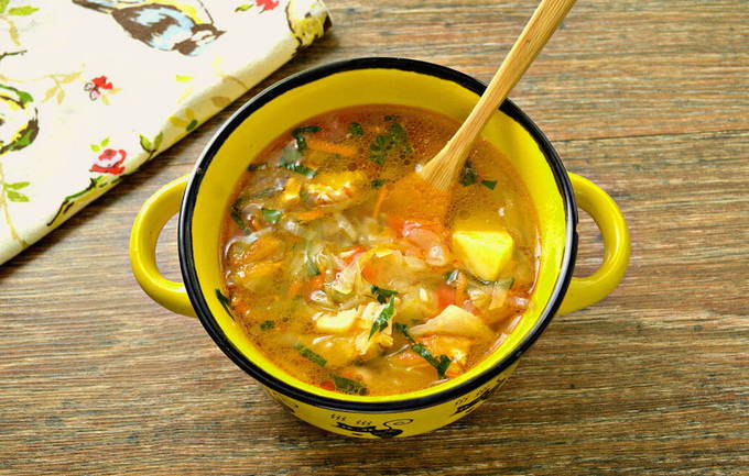 Stap-voor-stap recept voor het koken van koolsoep met kip zonder te frituren