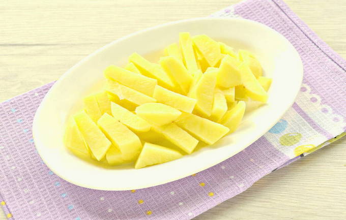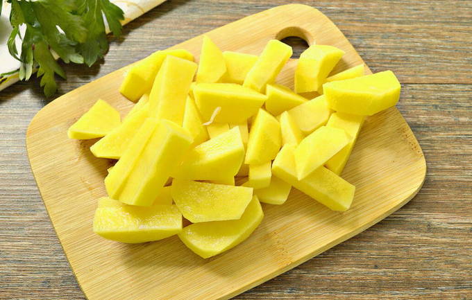 - We schillen de aardappelen, spoelen ze af met stromend water en snijden ze in middeldikke repen of repen. We sturen het naar de bouillon.