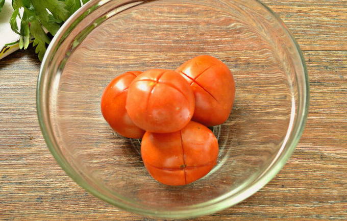 - Doe de tomaten in een aparte kom en snijd een beetje. Verbranden met kokend water en onmiddellijk in koud water plaatsen. Wij verwijderen de huid.
