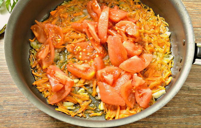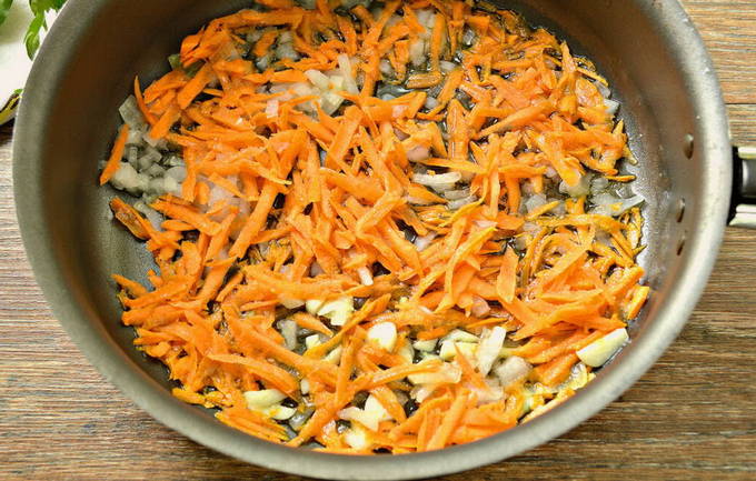 - We maken de wortel schoon. We spoelen met warm water. We wrijven op een rasp. Haal de schil van de ui, halveer deze met een scherp mes en snijd in kleine blokjes. We zetten een koekenpan met olie op de brander, zetten het fornuis aan. Begin na het opwarmen uien en wortels te sauteren. Tomatenpuree toevoegen en roeren.