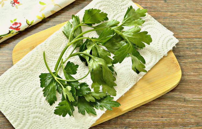 - We nemen de peterselie en spoelen hem af onder stromend water, drogen hem af met een papieren handdoek. Hak vervolgens fijn.