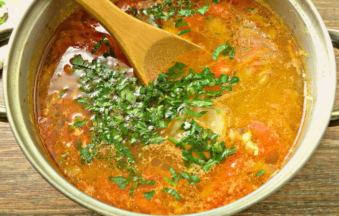 Verdun voor een rijkere smaak het traditionele recept voor koolsoep met groenten en tomaten gebakken in een pan, evenals specerijen en kruiden.