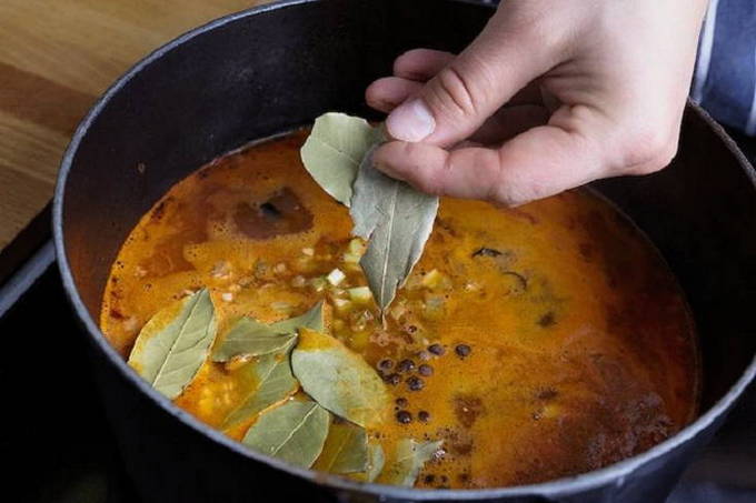- Vul alles met water. Voeg zout en kruiden toe, voeg laurierblaadjes toe. Dek de apparatuur goed af met een deksel erop.