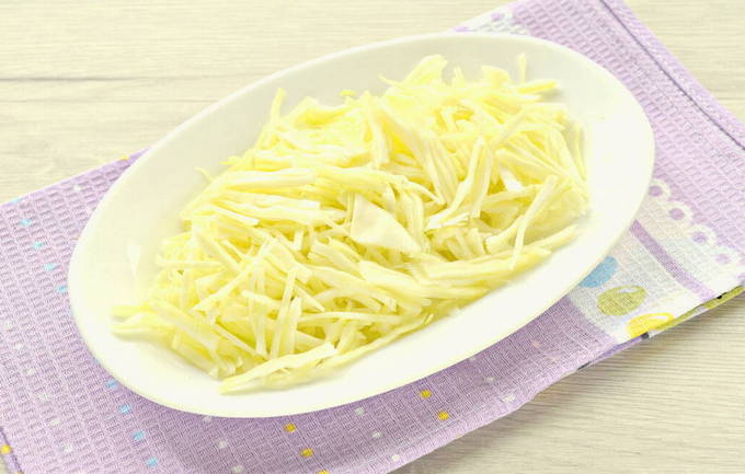 - Rasp de kool met een scherp mes. Voeg het toe aan de pan en ga verder met koken.