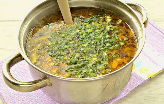 - Bestrooi de koolsoep met kruiden, spoel de verse groene ui af en hak hem fijn. We sturen naar de pan.