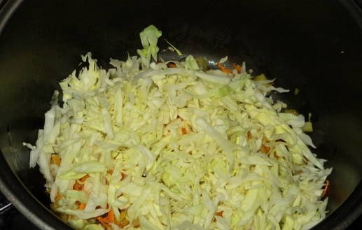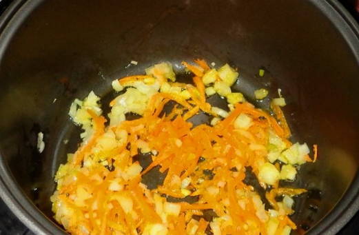 - We zetten de multicooker aan en stellen de frituurmodus in. Giet olie in een kom en voeg een mengsel van uien en wortelen toe. Bak 5 minuten.