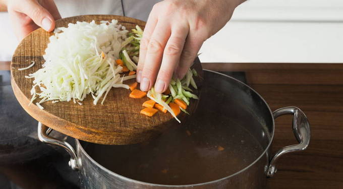 Voeg groenten - wortelen en selderij toe aan de afgewerkte bouillon. Kook gedurende vijf minuten. Dan - uien en kool. Laat het nog vijf minuten in brand staan.