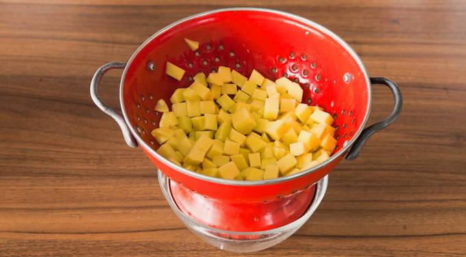 Aardappels schillen, afspoelen, in blokjes snijden. We doen de aardappelen in een vergiet en spoelen om overtollig zetmeel weg te spoelen.