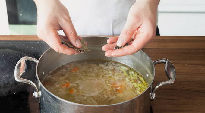 - De groenten zijn klaar om te koken. Voeg ze toe aan de bouillon en kook. Breng aan de kook, bestrooi met zout en laat 20 minuten staan. Voeg 5 minuten voor het einde van de bereiding laurierblad en peper toe.
