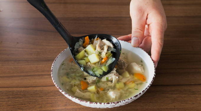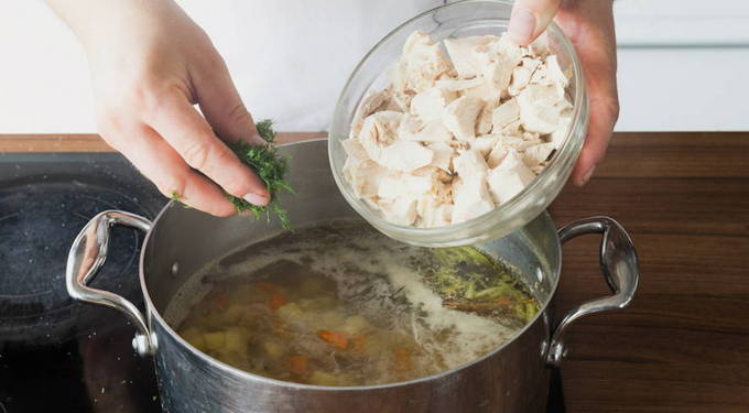 Als je de bouillon niet kookt met een hele kip, maar met kipfilets, wordt de soep rijker, minder vet en gezond.