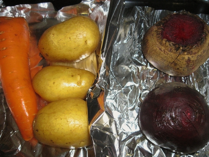 - Spoel de bieten, wortelen en aardappelen grondig af onder stromend water. Om deze optie te bereiden, zullen we de groenten niet koken, maar in de oven bakken. Zet hem daarom van tevoren aan op 200°C. Droog de gewassen groenten af met keukenpapier en wikkel ze in folie. Leg de groenten op een bakplaat en zet ze 45 minuten in een goed verwarmde oven (controleer de gaarheid van de groenten met een mes of vork: als de groenten goed doorboren, kun je ze uit de oven halen).