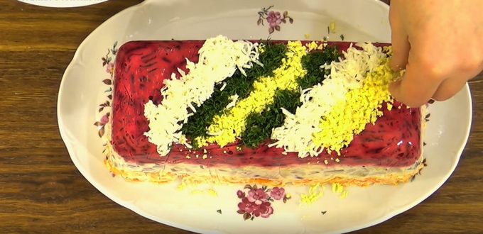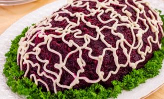 En tot slot, de laatste, vijfde laag - geraspte gekookte bieten. Leg het zorgvuldig uit zodat de vorige lagen nergens verschijnen. Bovenop kun je verschillende figuren tekenen met een dunne laag mayonaise of gewoon mayonaise smeren (na een tijdje krijgt het een mooie roze kleur, gekleurd met bietensap). Spoel de greens af en droog een beetje. Schik de takjes dille of peterselie rond de salade en vorm een soort "rok". Zet een paar uur in de koelkast zodat de laagjes goed doorweekt zijn.