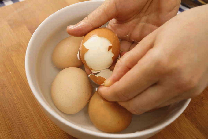 - Je moet ook kippeneieren 10 minuten in kokend water koken, zodat tijdens het schoonmaken van de schaal de eieren gemakkelijker te pellen zijn, leg ze na het koken 5-10 minuten in koud water, wrijf de gepelde eieren op een grove rasp .