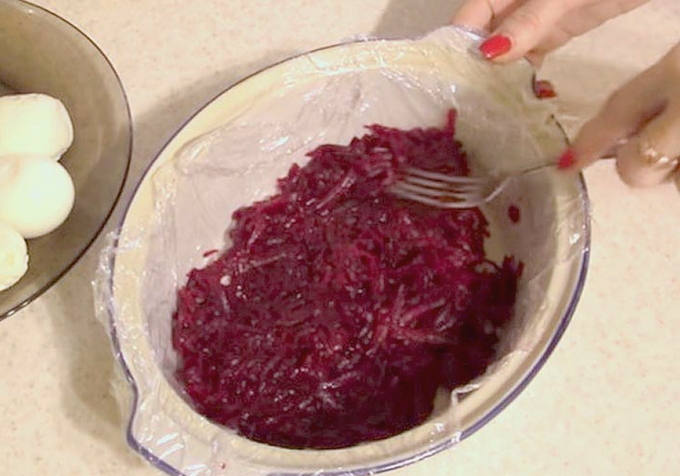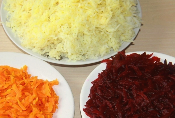 - De gebakken groenten moeten tegen die tijd afgekoeld zijn, dus schil de bieten, wortelen en aardappelen. Rasp elke soort groenten op een grove rasp in aparte bakjes. Voeg 1-2 eetlepels van het mayonaise-gelatinemengsel toe aan een kom met bieten en meng goed.