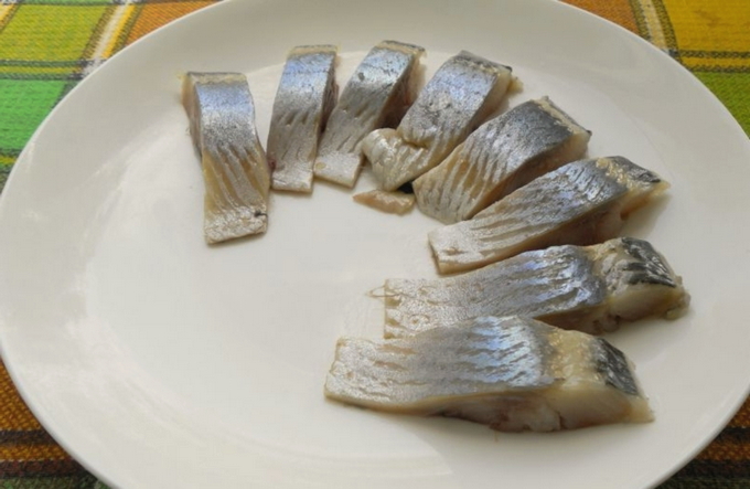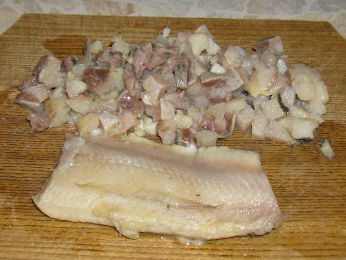 - Schil de haring en snij in kleine stukjes. Om het proces te versnellen, is het beter om haringfilets te gebruiken.