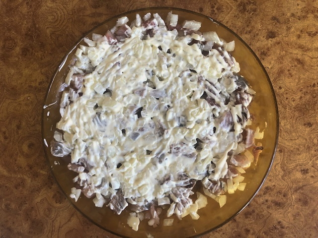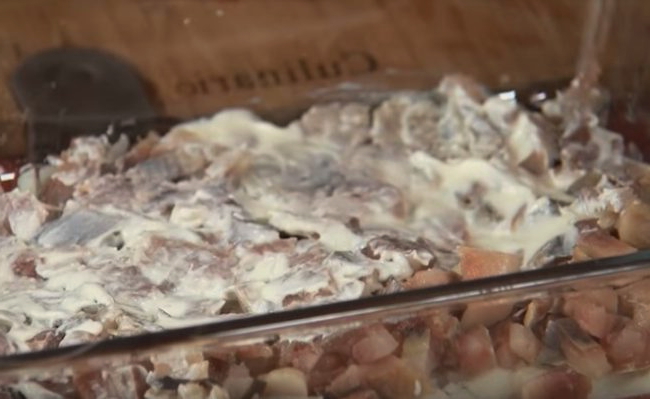 - Leg een laag haring op de ui, en geraspte aardappelen met mayonaise erop.