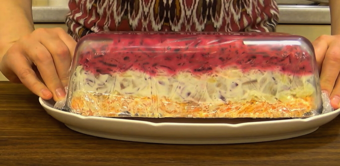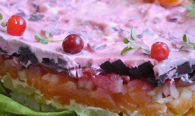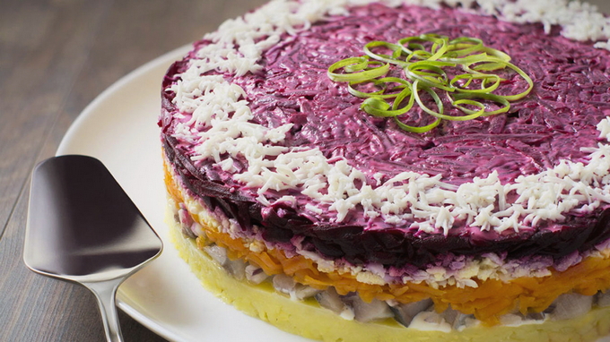 Misschien is dit de meest ongewone en lekkerste optie om haring onder een bontjas te koken. Uw gasten zullen gegarandeerd versteld staan en zullen u hoogstwaarschijnlijk om een recept voor deze heerlijke salade vragen!