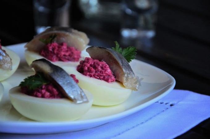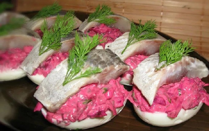 - Pel de eieren en snij in 2 stukken. Leg de helften van de eieren, in stukken gesneden (de onderkant kan een beetje worden bijgesneden om onze "taartjes" stabieler te maken) en bedek met de rode bietvulling. Leg 1-2 stukjes vis op de vulling.