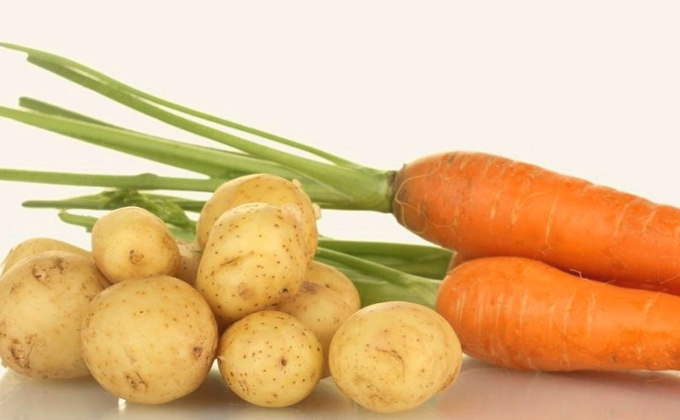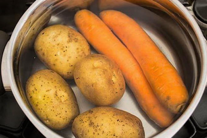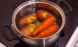 - Kook de aardappelen en wortelen tot ze gaar zijn. Zet nu alle groenten een paar uur in de koelkast (dankzij deze procedure plakken de groenten niet aan elkaar nadat je ze hebt ingewreven).