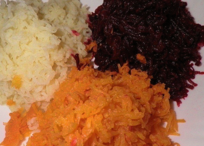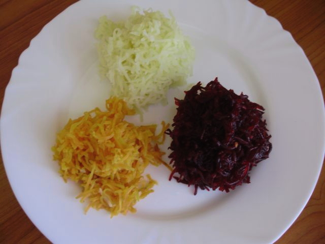 - Schil de aardappelen, wortelen en bieten en rasp ze vervolgens fijn (elke groente in een apart bord).