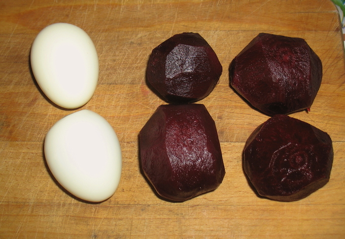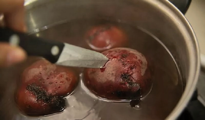 - De eerste stap is het koken van de bieten (dit kun je het beste vooraf doen, bij voorkeur 's avonds). Spoel het onder stromend water af en doe het in een kleine steelpan. Giet genoeg water over de bieten om de groente met ongeveer 2-3 vingers te bedekken. Breng het water aan de kook in een pan en zet het vuur lager. Bieten worden matig gekookt tot ze zacht zijn (ongeveer 1-1,5 uur). Als de groente gemakkelijk met een vork te doorboren is, is hij klaar. Zorg ervoor dat het water niet kookt, anders koken de bieten ongelijkmatig. Verwijder na het koken de gekookte groente op een bord en laat afkoelen.