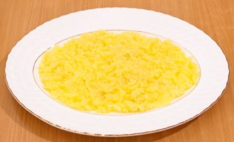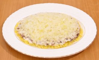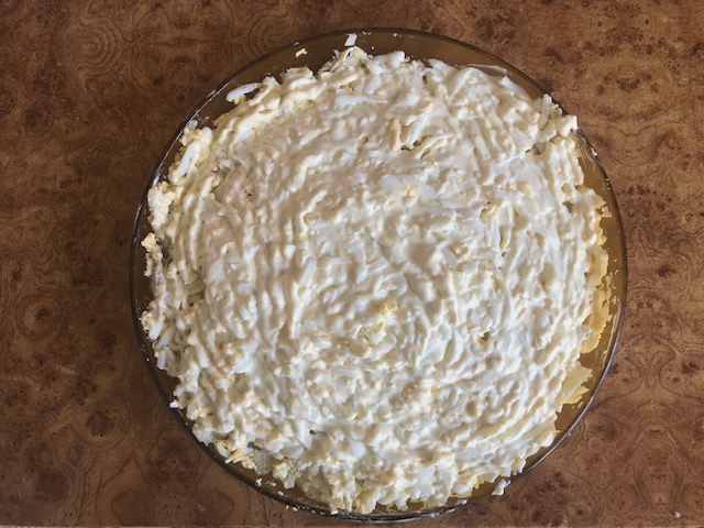 - Leg de geraspte eieren op de aardappelen, 2-3 centimeter verwijderd van de vorige laag. Bedek de eieren met een mayonaisenet.