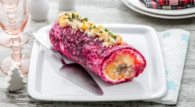 Probeer de beroemde salade te maken, maar verander de presentatie enigszins. Haring onder een bontjas kan in een pitabroodje in geportioneerde stukken worden gesneden. Naast dat zo'n presentatie er heel origineel uitziet, is het ook nog eens erg handig, want iedereen mag een klein stukje meenemen om te proberen. Deze salade is niet alleen perfect voor een huismaaltijd, maar ook voor een buffettafel.