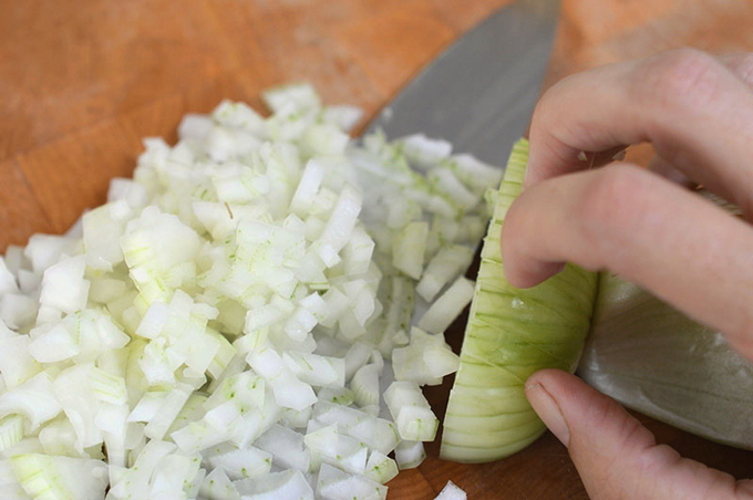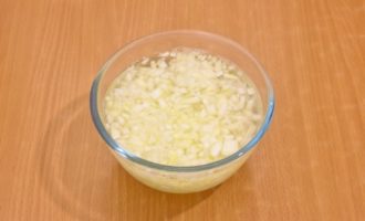 - Schil de uien en snijd ze in voldoende kleine blokjes. Zodat de ui in de salade niet bitter smaakt, is het beter als je er 10 minuten kokend water overheen giet. Na zo'n stomen krijgt de groente een delicate smaak zonder ook maar een zweem van bitterheid. Giet het water goed af en pers de ui.