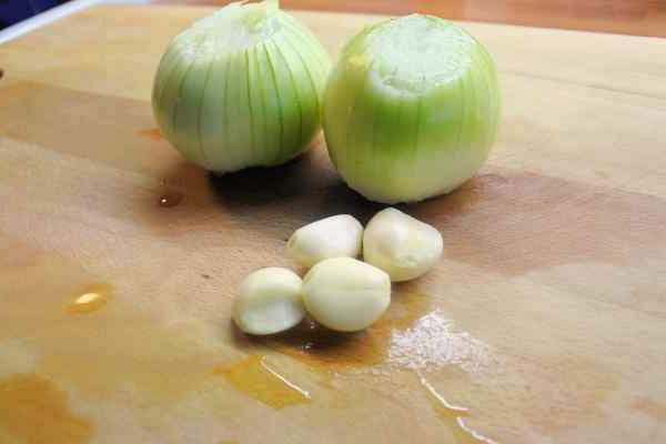 - Pel de uien en knoflook. Haal de knoflook door een pers en hak de ui fijn. Om te voorkomen dat de salade bitter wordt, moet je de plakjes gesnipperde uien ongeveer 10 minuten in een kom met kokend water houden. Giet af en pers de ui.