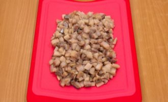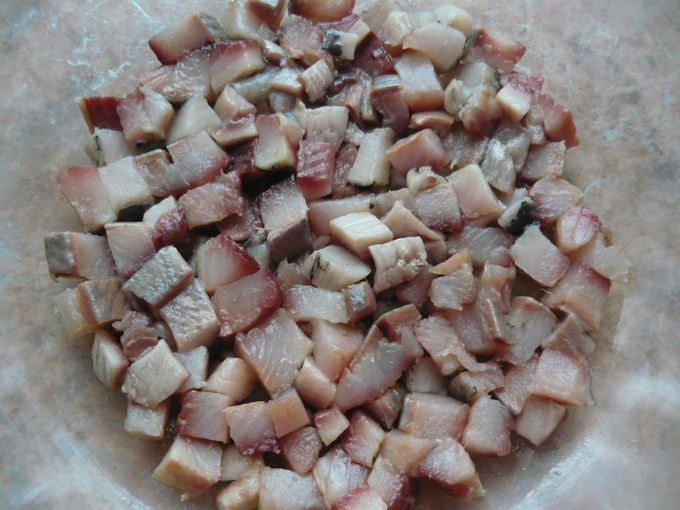 Het was de beurt aan de haring. Eerst moet u het inspecteren op de aanwezigheid van kleine botten en, indien aanwezig, deze verwijderen. Snijd vervolgens de haring in smalle reepjes en de reepjes in kleine blokjes.