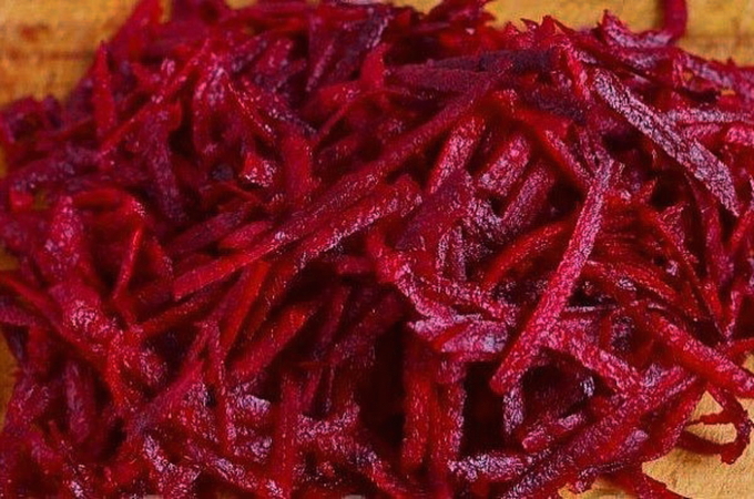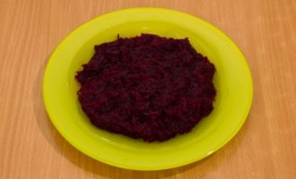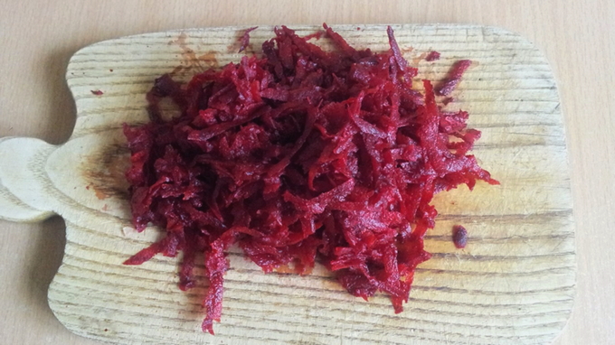 Verwijder de schil van de afgekoelde bieten en rasp de bieten zelf op een middelgrote of fijne rasp.