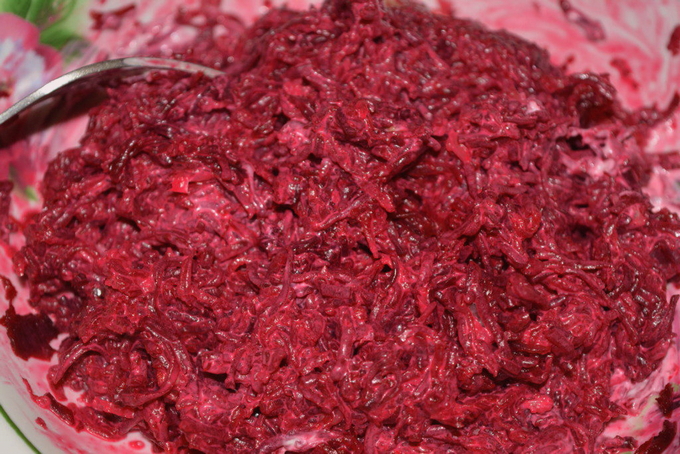 - Schil de afgekoelde bieten en rasp ze op een middelgrote rasp. Combineer de geraspte rode biet met de ui en knoflook. Voeg een paar eetlepels mayonaise toe aan de resulterende massa en meng.