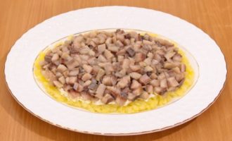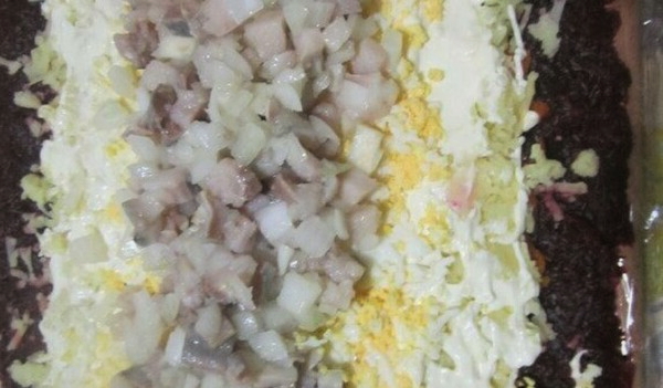 - Het is tijd om de ingrediënten in lagen in de slakom te leggen. Dus de eerste laag in deze versie van de salade is fijngehakte haring. Bestrijk de eerste laag met zure room-mayonaisesaus.