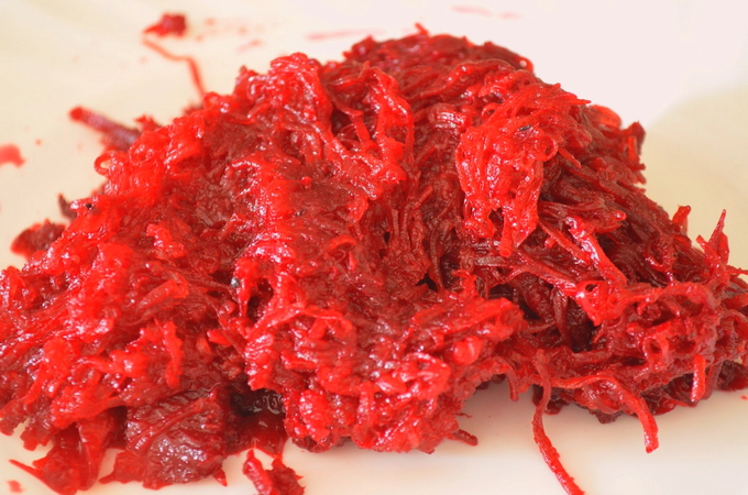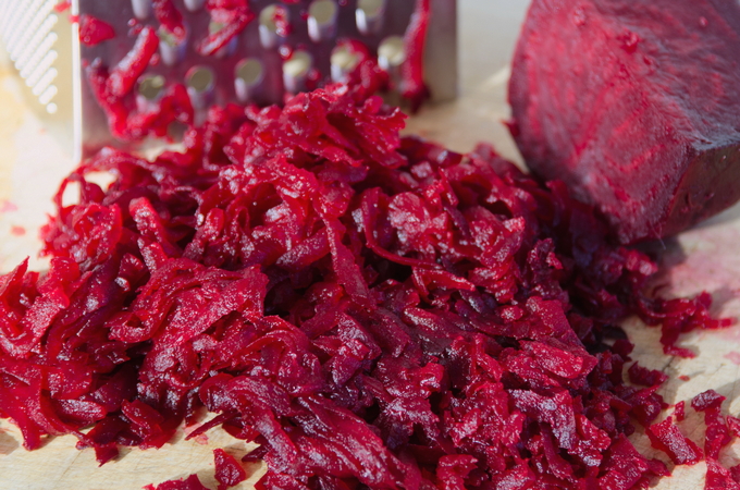 - Haal de gekookte bieten uit de koelkast en schil ze. Rasp op een fijne rasp.