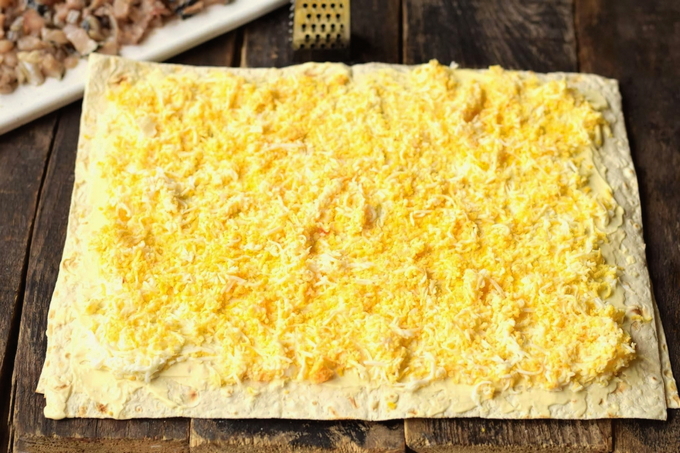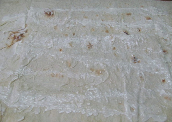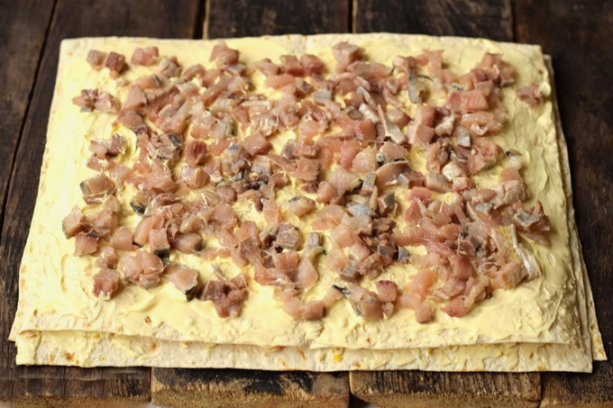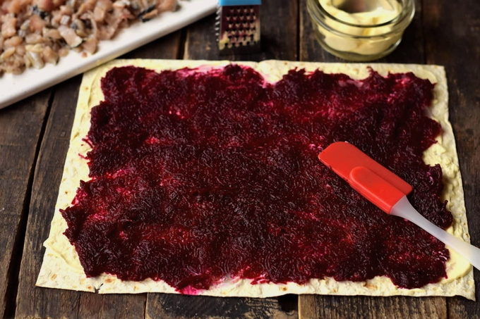 - Het is tijd om te beginnen met het assembleren van haring onder een bontjas in pitabroodje. Neem hiervoor een stuk folie en leg er een vel pitabroodje op. Smeer het goed in met mayonaise (dunne laag).