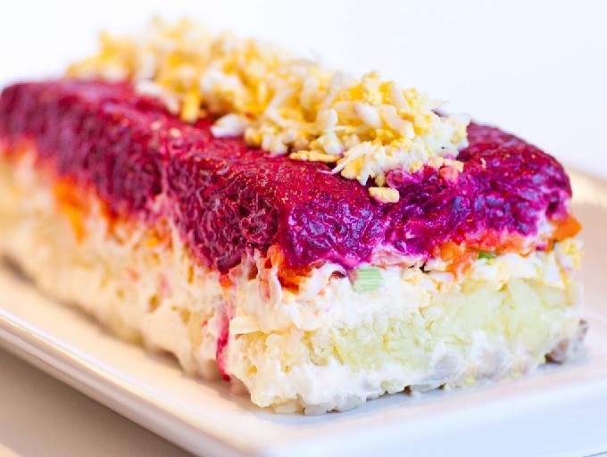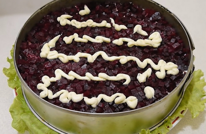 - Alles is klaar, het is tijd om de salade in lagen te verzamelen. Leg eerst een laag geraspte aardappelen op een langwerpig bord. Giet er een laag mayonaise op (je kunt een gaas maken, of je kunt het voorzichtig uitsmeren). Dit wordt gevolgd door een laag fijngehakte haring, besprenkeld met mayonaise. Leg na de vis een laag uien met een mayonaise-gaas. De vijfde laag zijn geraspte wortelen, die ook bedekt moeten worden met een laag mayonaise erop. De zesde laag is geraspte appels en een net van mayonaise. Bieten worden in de allerlaatste laag gelegd en bedekken alle voorgaande lagen volledig. De bovenkant van de salade kan worden versierd met mayonaisegaas en verse kruiden.