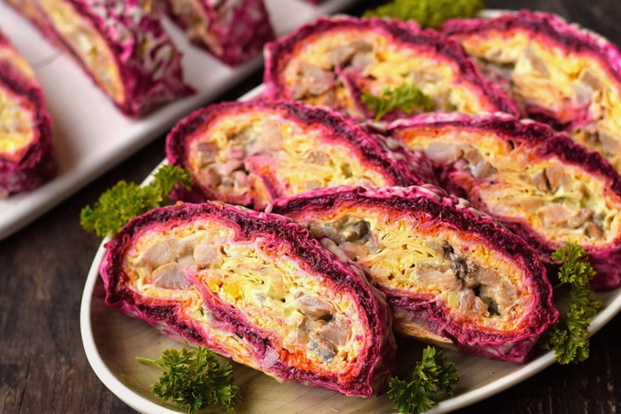 - Voordat u de salade op tafel serveert, verwijdert u deze voorzichtig uit de film, giet u een beetje mayonaise, garneer met verse kruiden en snijd in porties.