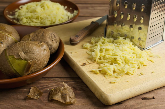 Schil en rasp de aardappelen op een grove rasp, zoals we deden met wortelen en bieten.