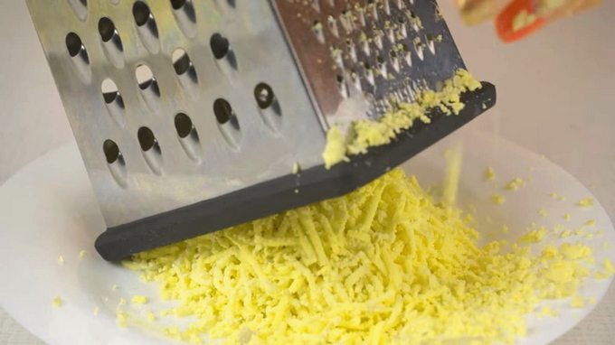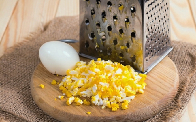 - Kook de eieren hard (u moet 10 minuten koken in kokend water en dan 5-10 minuten in zeer koud water houden - dit zal het gemakkelijker maken om de schaal te verwijderen). Rasp kippeneieren met een fijne rasp.