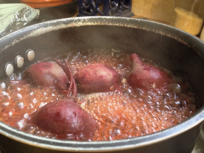 Spoel de bieten af met voldoende water om alle aarde weg te spoelen.Doe de bieten in een pan en bedek ze met water, kook de bieten, nadat het water kookt, ongeveer 1-2 uur tot ze zacht zijn (zorg ervoor dat het water niet kookt). Leg de afgewerkte bieten op een bord en laat volledig afkoelen.