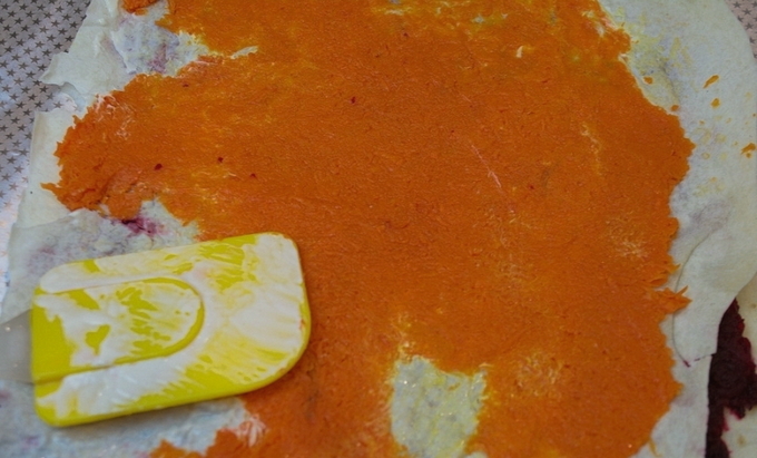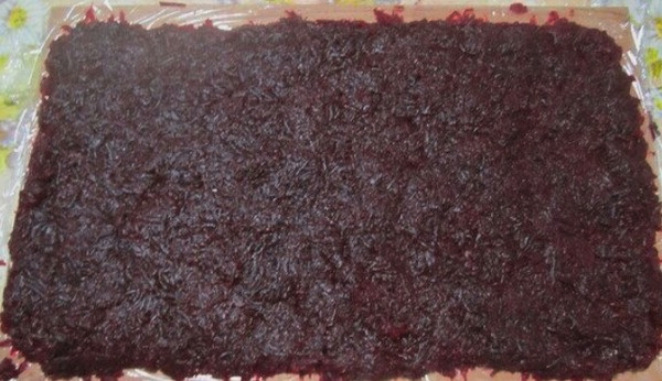 - Spreid huishoudfolie uit van hetzelfde formaat op de tafel als je van plan bent te rollen. Leg eerst een laag grof geraspte bieten. Je kunt een beetje zout toevoegen en de bieten met je handen aandrukken, zodat de rol in de toekomst beter zijn vorm behoudt.