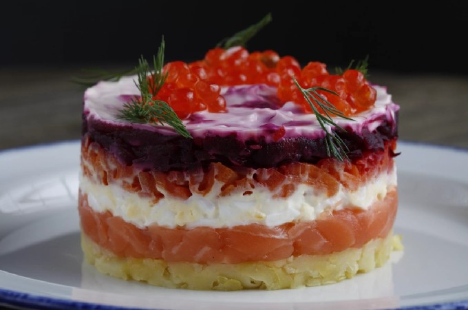 - Bladerdeegharing onder een bontjas met zalm en rode kaviaar