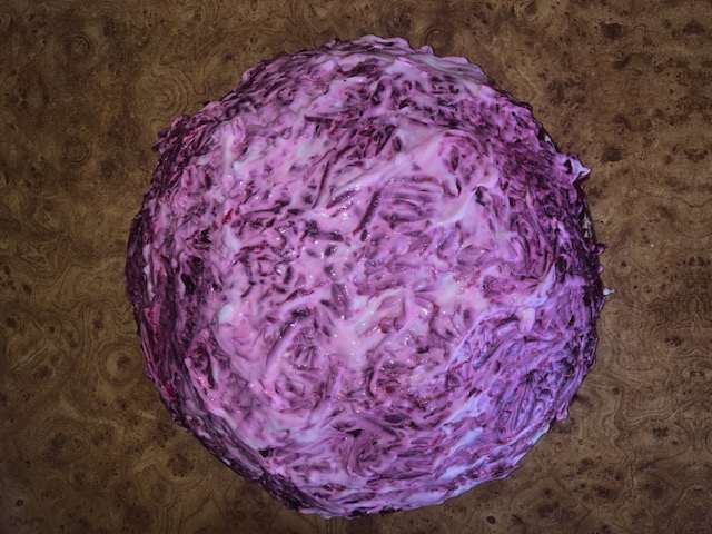 - De eerste laag is om de geraspte gekookte bieten neer te leggen. Smeer er een dun laagje mayonaise op.